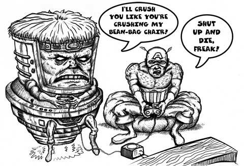 Have you seen the gameplay to Marvel Vs. Capcom 3? Here it is! Brian sent us this awesome depiction of MODOK vs. Captain America, laying down the smack talk, and apparently still rocking the GameCube! I'm betting that MODOK has enabled as many cheats as he can! Thanks for your contribution, Brian! Exclamation points!