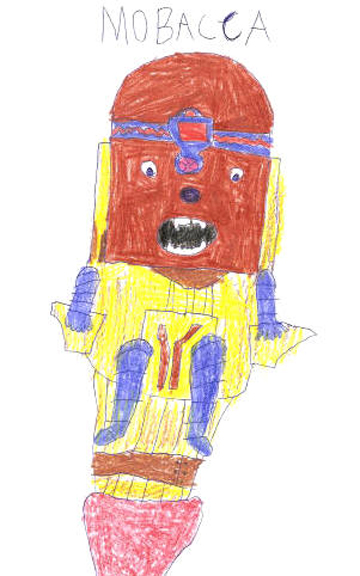 "I used colored pencils to make "Mobacca" because it was a mix of Modok and Chewbacca. It came to me because I was playing Star Wars when we drew it and because I like Chewbacca because he is fuzzy."
