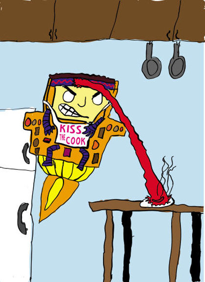 "My picture has Modok trying to cook a hot dog with his head laser. It came to me when I was looking at the Superhero Squad one-panel comics and thought I'd try my own joke. I drew it with a pencil, but used Adobe Illustrator to color it."