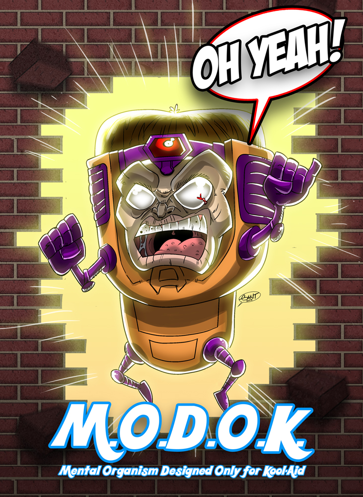 What's big, round, and busts through walls? Oh yeeeaaaahhhh, George Gant sends us this KoolAid man inspired MODOK. For some caffeine-fueled fun, check out George's webcomic, On the Grind.